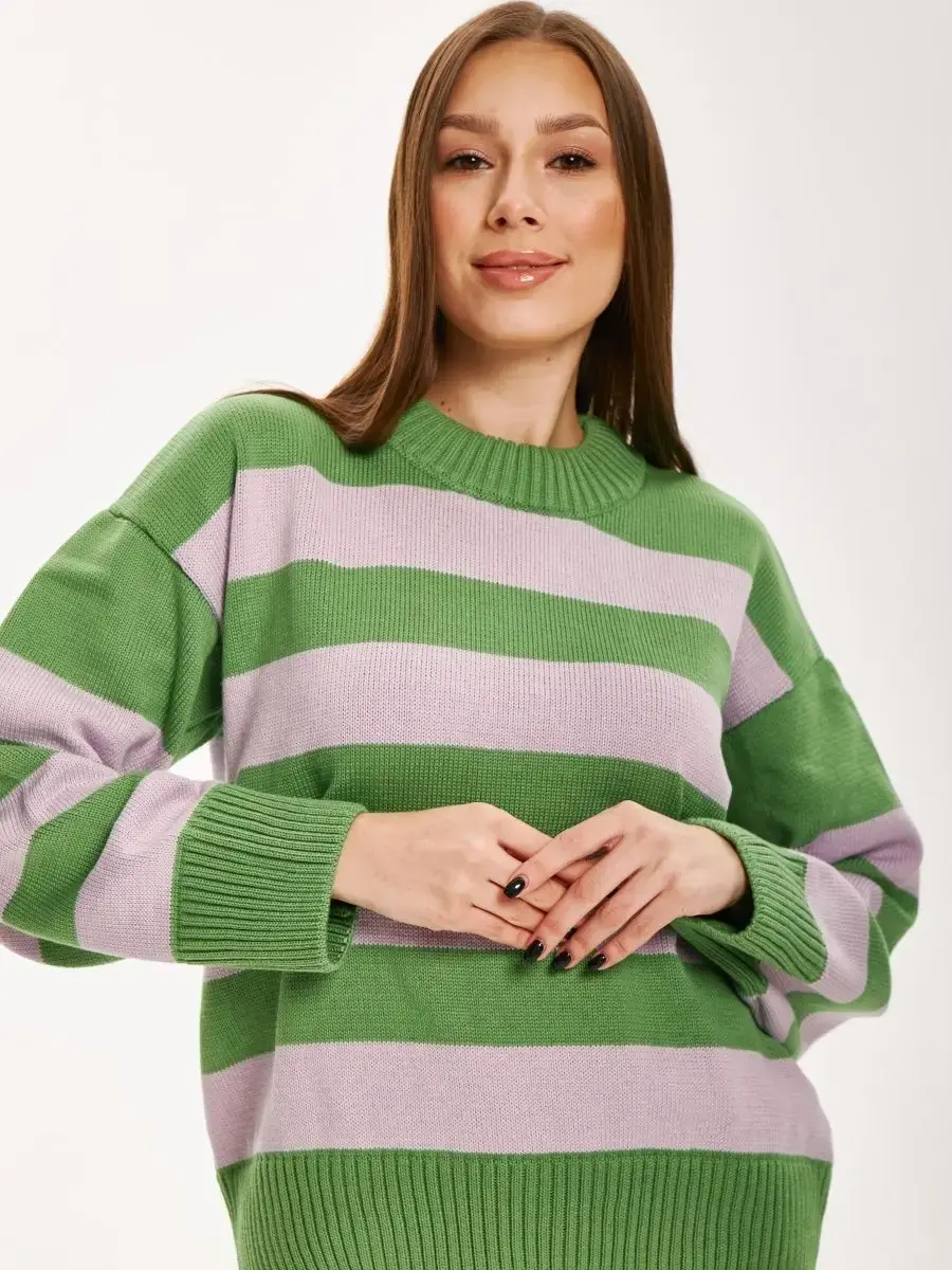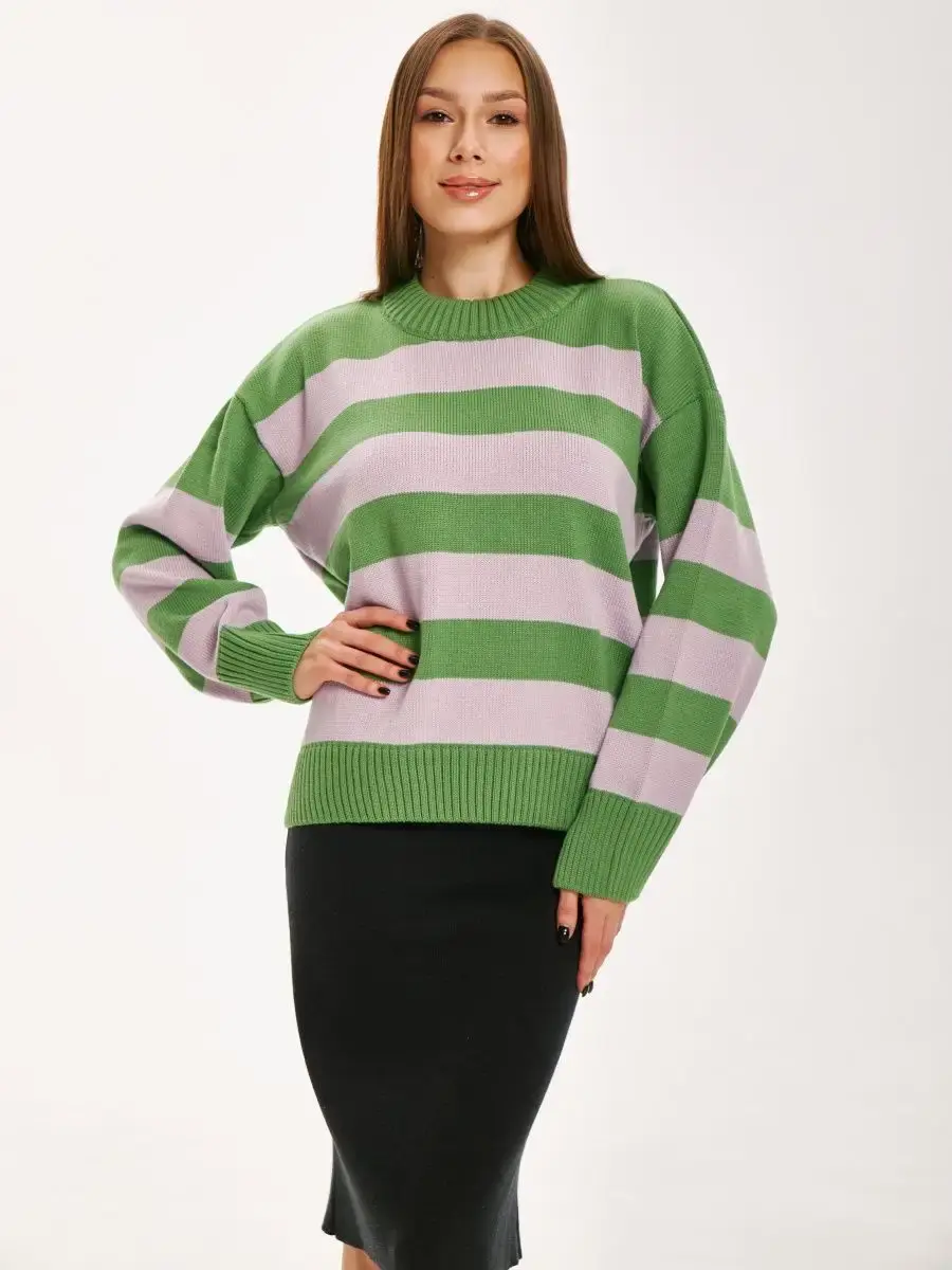 Женский джемпер MODCLICK в полоску. Женский джемпер в полоску от бренда MODCLICK - это ультрасовременный джемпер, который подойдет для создания большого количества образов. Он подчеркнет утонченность или скроет особенности фигуры, но в любом случае, любая девушка или женщина будет чувствовать себя комфортно и раскованно. Оверсайз-модель имеет универсальный размер от 40 до 52, поэтому этот джемпер подойдет для леди разных размеров. Рост модели на фотографии - 178 см, размер на фото - 42. Джемпер выполнен из 50% хлопка и 50% акрила, что делает его мягким, теплым и долговечным. Трикотажная ткань приятна на ощупь и удобна в носке. Свободный силуэт и круглый вырез создают комфорт и свободу движений. Длинный рукав и средняя длина джемпера подчеркивают женственность и элегантность. Принт в виде полосок придает шарм и оригинальность. Этот джемпер подходит для повседневной носки и сочетается с разными стилями одежды. Он отлично подойдет для офиса, прогулок, встреч с друзьями и отдыха.