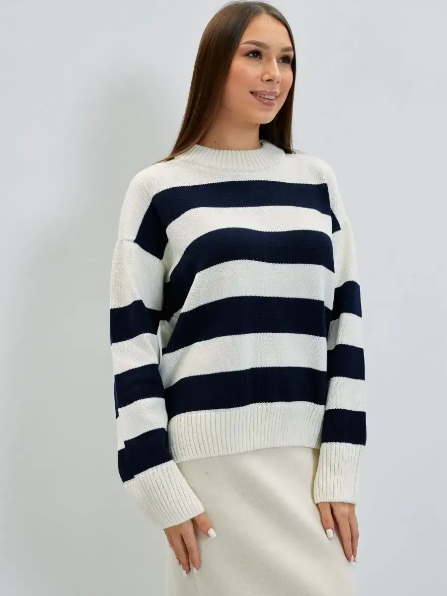 Женский джемпер MODCLICK в полоску. Женский джемпер в полоску от бренда MODCLICK - это ультрасовременный джемпер, который подойдет для создания большого количества образов. Он подчеркнет утонченность или скроет особенности фигуры, но в любом случае, любая девушка или женщина будет чувствовать себя комфортно и раскованно. Оверсайз-модель имеет универсальный размер от 40 до 52, поэтому этот джемпер подойдет для леди разных размеров. Рост модели на фотографии - 178 см, размер на фото - 42. Джемпер выполнен из 50% хлопка и 50% акрила, что делает его мягким, теплым и долговечным. Трикотажная ткань приятна на ощупь и удобна в носке. Свободный силуэт и круглый вырез создают комфорт и свободу движений. Длинный рукав и средняя длина джемпера подчеркивают женственность и элегантность. Принт в виде полосок придает шарм и оригинальность. Этот джемпер подходит для повседневной носки и сочетается с разными стилями одежды. Он отлично подойдет для офиса, прогулок, встреч с друзьями и отдыха.